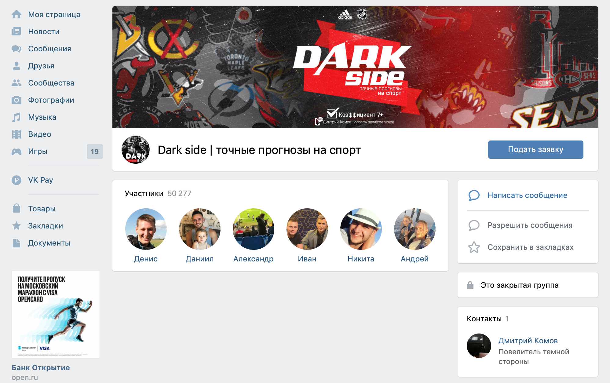- В группе Дмитрий предлагает купить высокоточные прогнозы на спорт. В некоторых случаях он говорит, что у него есть инсайдерская информация на матч, где он знает заранее победителя. Это вызывает большие вопросы.