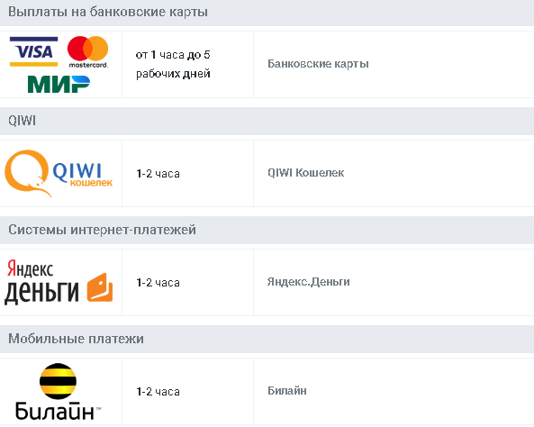 - Разнообразие вариантов для пополнения счета и вывода выигрышей всегда интересовало новых пользователей в первую очередь. Чем больше выбора тем проще клиенту. И конечно, не нужно забывать, что время вывода денежных средств, также является основным показателем качественной букмекерской конторы.