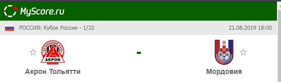Акрон (Тольятти) vs Мордовия (Саранск), который состоится 21.08.2019 в 18:00 по МСК.