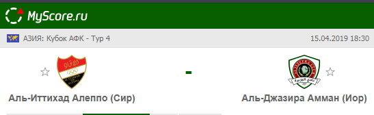 Аль-Иттихад Алеппо (Сирия) vs Аль-Джазира Амман (Иордания), который состоится 15.04.2019 в 18:30 по МСК.