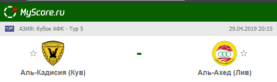 Аль-Кадисия (Кувейт) vs Аль-Ахед (Ливан), который состоится 29.04.2019 в 20:15 по МСК.