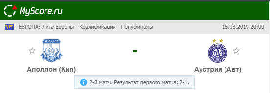 Аполлон (Кипр) vs Аустрия (Австрия), который состоится 15.08.2019 в 20:00 по МСК.