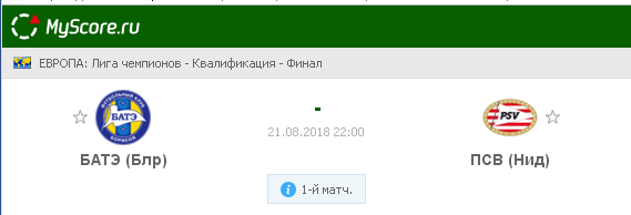 БАТЭ (Беларусь) vs ПСВ (Нидерланды), который состоится 21.08.2018 в 22:00 по МСК.