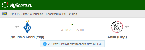 Динамо Киев (Украина) vs Аякс (Нидерланды), который состоится 28.08.2018 в 22:00 по МСК.