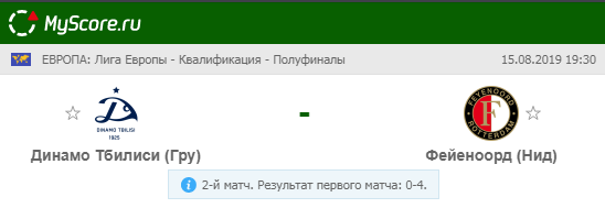 Динамо Тбилиси (Грузия) vs Фейеноорд (Нидерланды), который состоится 15.08.2019 в 19:30 по МСК.