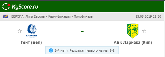 Гент (Бельгия) vs АЕК Ларнака (Кипр), который состоится 15.08.2019 в 21:30 по МСК.