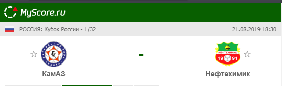 КамАЗ (Набережные Челны) vs Нефтехимик (Нижнекамск), который состоится 21.08.2019 в 18:30 по МСК.