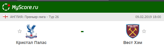 Кристал Пэлас (Лондон) vs Вест Хэм Юнайтед (Лондон), который состоится 09.02.2019 в 18:00 по МСК.