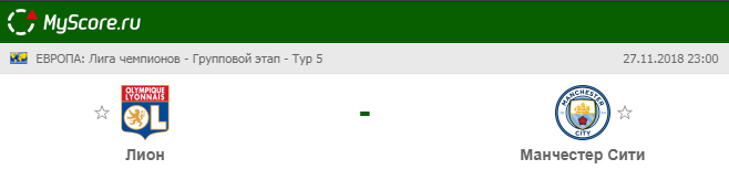 Лион (Франция) vs Манчестер Сити (Англия), который состоится 27.11.2018 в 23:00 по МСК.