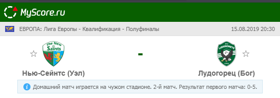 Нью-Сейнтс (Уэльс) vs Лудогорец (Болгария), который состоится 15.08.2019 в 20:30 по МСК.