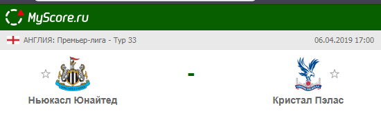 Ньюкасл Юнайтед (Ньюкасл) vs Кристал Пэлас (Лондон), который состоится 06.04.2019 в 17:00 по МСК.