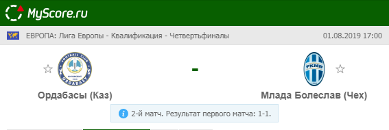 Ордабасы (Казахстан) vs Млада-Болеслав (Чехия), который состоится 01.08.2019 в 17:00 по МСК.