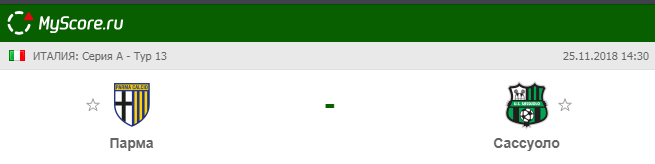 Парма (Парма) vs Сассуоло (Сассуоло), который состоится 25.11.2018 в 14:30 по МСК.