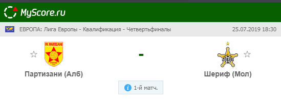 Партизани (Албания) vs Шериф (Молдавия), который состоится 25.07.2019 в 18:30 по МСК.