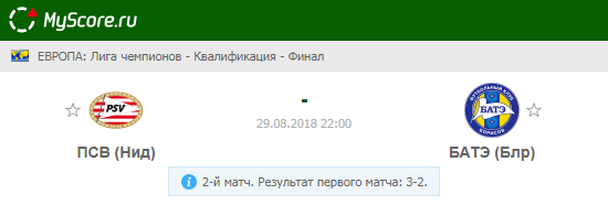 ПСВ (Нидерланды) vs БАТЭ (Беларусь), который состоится 29.08.2018 в 22:00 по МСК.