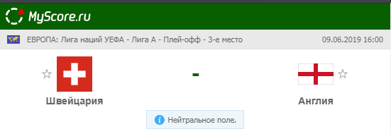 Сборная Швейцарии vs Сборная Англии, который состоится 09.06.2019 в 16:00 по МСК.