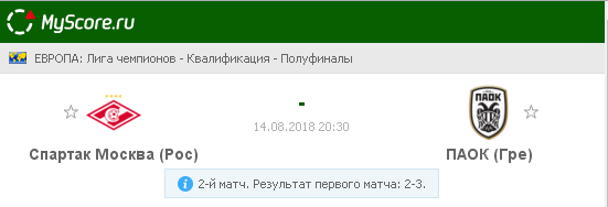 Спартак Москва (Россия) vs ПАОК (Греция), который состоится 14.08.2018 в 20:30 по МСК.