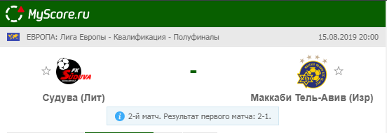 Добрый день, любители футбола. Следующий матч полуфинала квалификации Лиги Европы будет проведён в Мариямполе, что в Литве. Местная Судува примет у себя израильский Маккаби из Тель-Авива. В Израиле жёлтые дьяволы потерпели поражение, 1:2, так что сегодня им придётся выкладываться более чем на сто процентов, ведь даже победа с минимальным счётом не поможет им пройти дальше. Но несмотря на такое преимущество, букмекеры уверены в победе гостей, впрочем решающим фактором станет счёт, а Судуве во многом хватит одного, что бы максимально усложнить жизнь Маккаби.