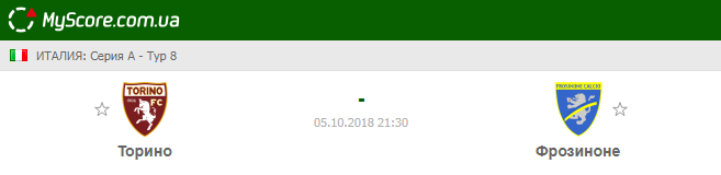 Торино (Турин) vs Фрозиноне (Фрозиноне), который состоится 05.10.2018 в 21:30 по МСК.