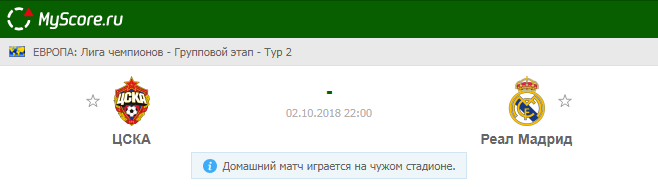 ЦСКА (Россия) vs Реал Мадрид (Испания), который состоится 02.10.2018 в 22:00 по МСК.