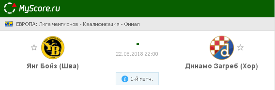 Янг Бойз (Швейцария) vs Динамо Загреб (Хорватия), который состоится 22.08.2018 в 22:00 по МСК.