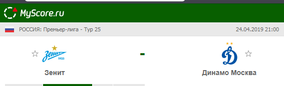 Зенит (Санкт-Петербург) vs Динамо (Москва), который состоится 24.04.2019 в 21:00 по МСК.