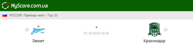 Зенит (Санкт-Петербург) vs Краснодар (Краснодар), который состоится 07.10.2018 в 16:30 по МСК.